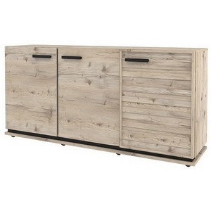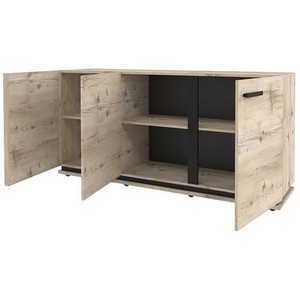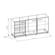 Тумба состоит из трех отделений, за распашными дверцами которых скрываются полки.