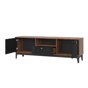 Тумба предлагает многоуровневую организацию пространства: вместительный выдвижной ящик для хранения медиааксессуаров, два отделения за распашными дверцами для техники и открытую полку для часто используемых предметов.