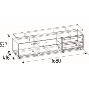 Тумба оснащена двумя закрытыми нишами и открытой секцией с полкой.