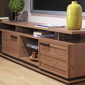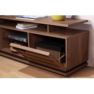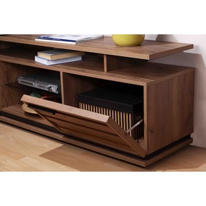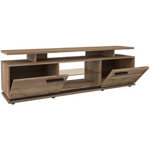 Тумба оснащена двумя закрытыми отделениями с дверями, 1 стеклянной полкой и 5 открытыми нишами.